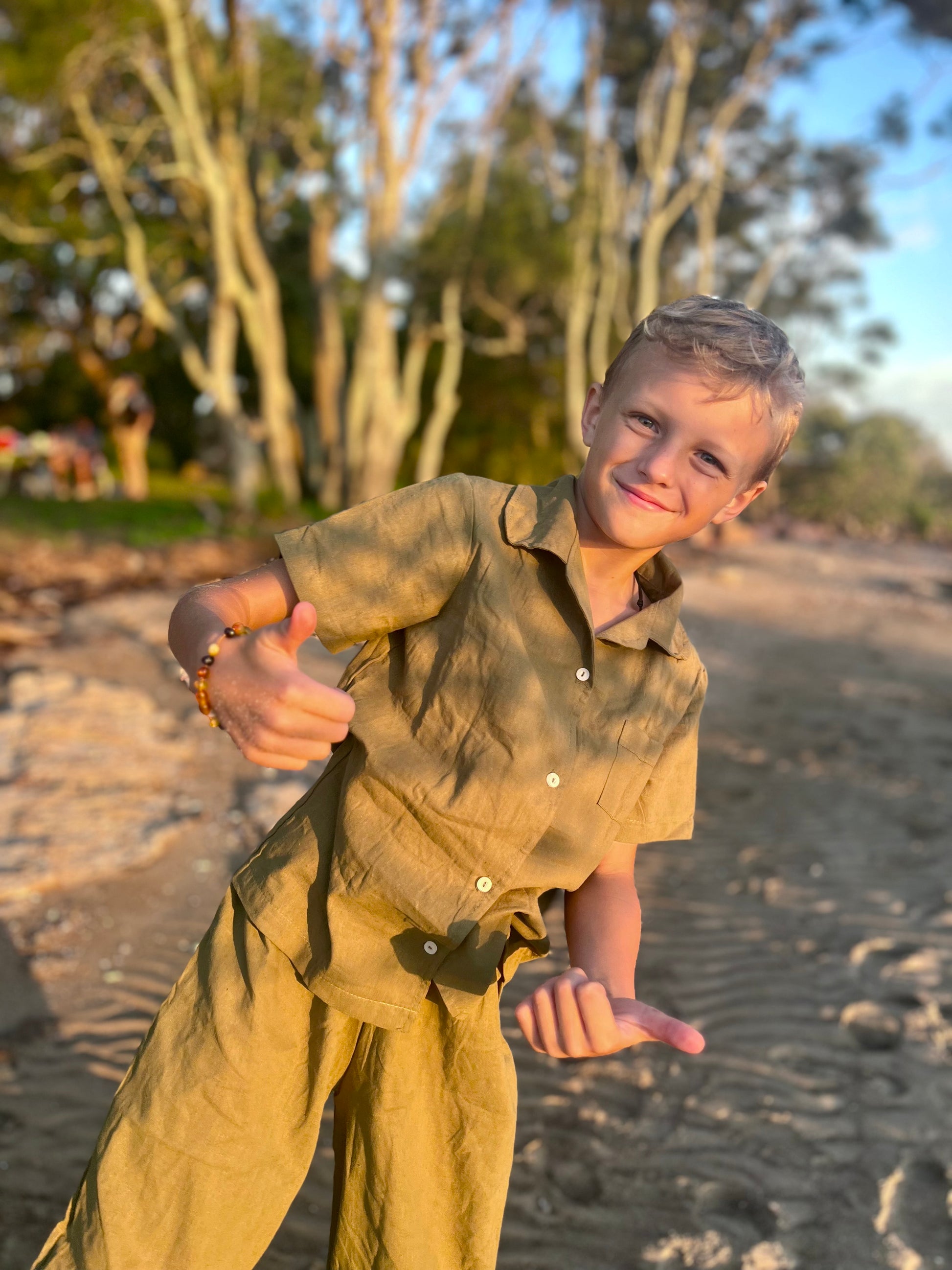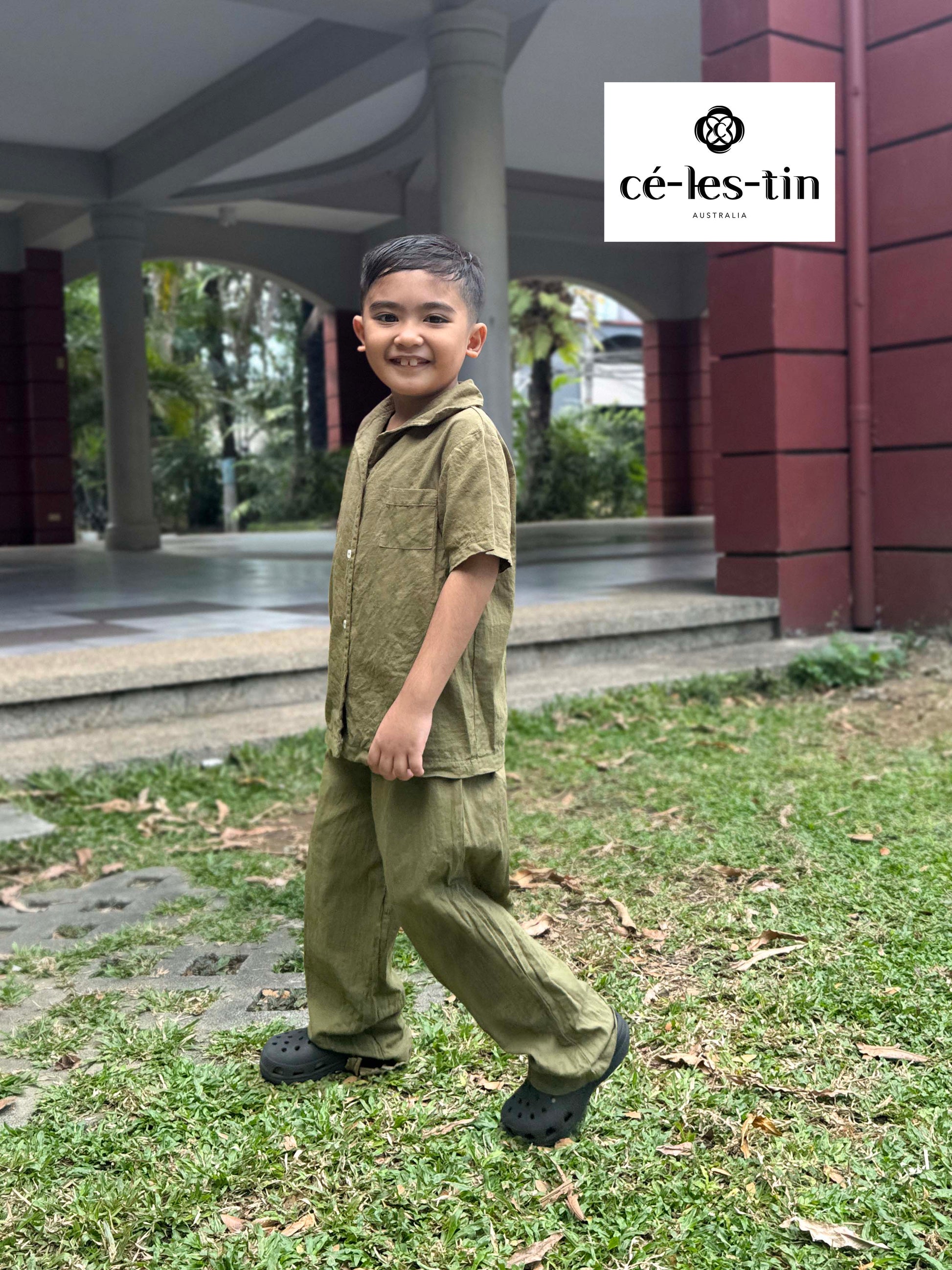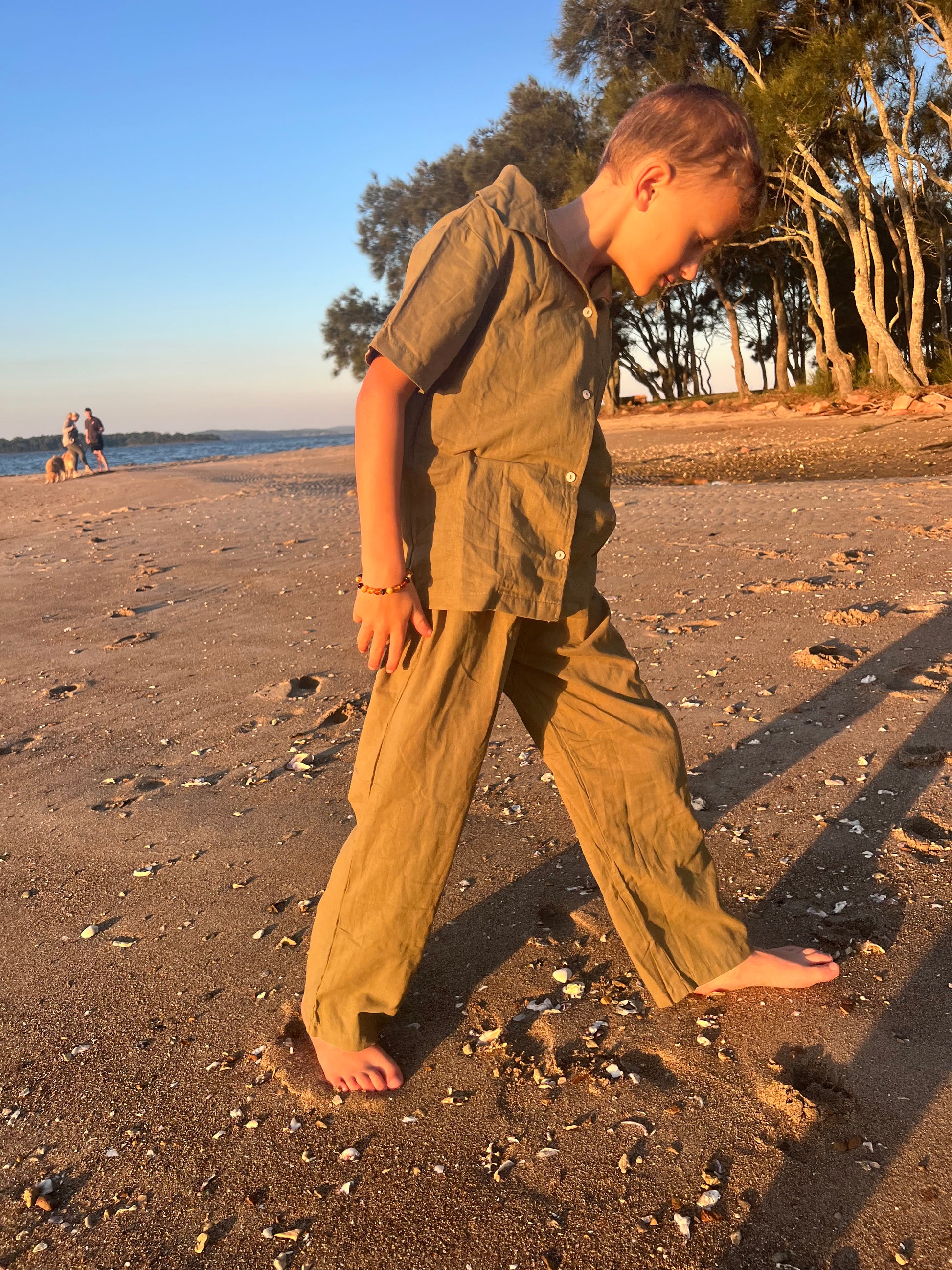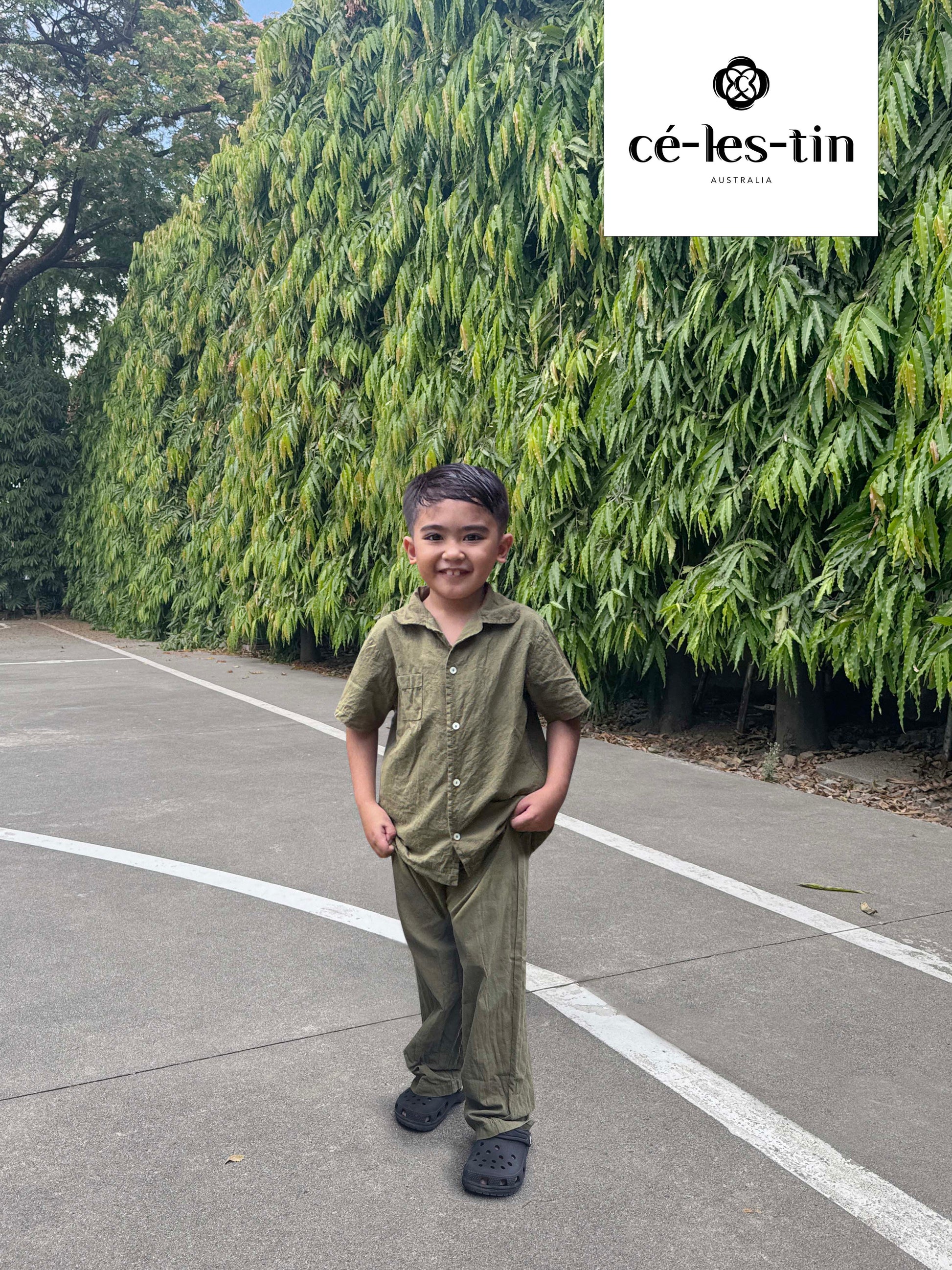 Designed for gentle days and joyful play, our signature coord set features a relaxed button-up top and comfy, elastic-waist pants. Carefully handmade using a breathable cotton-linen blend, it’s made to move with little ones from slow mornings to backyard adventures.