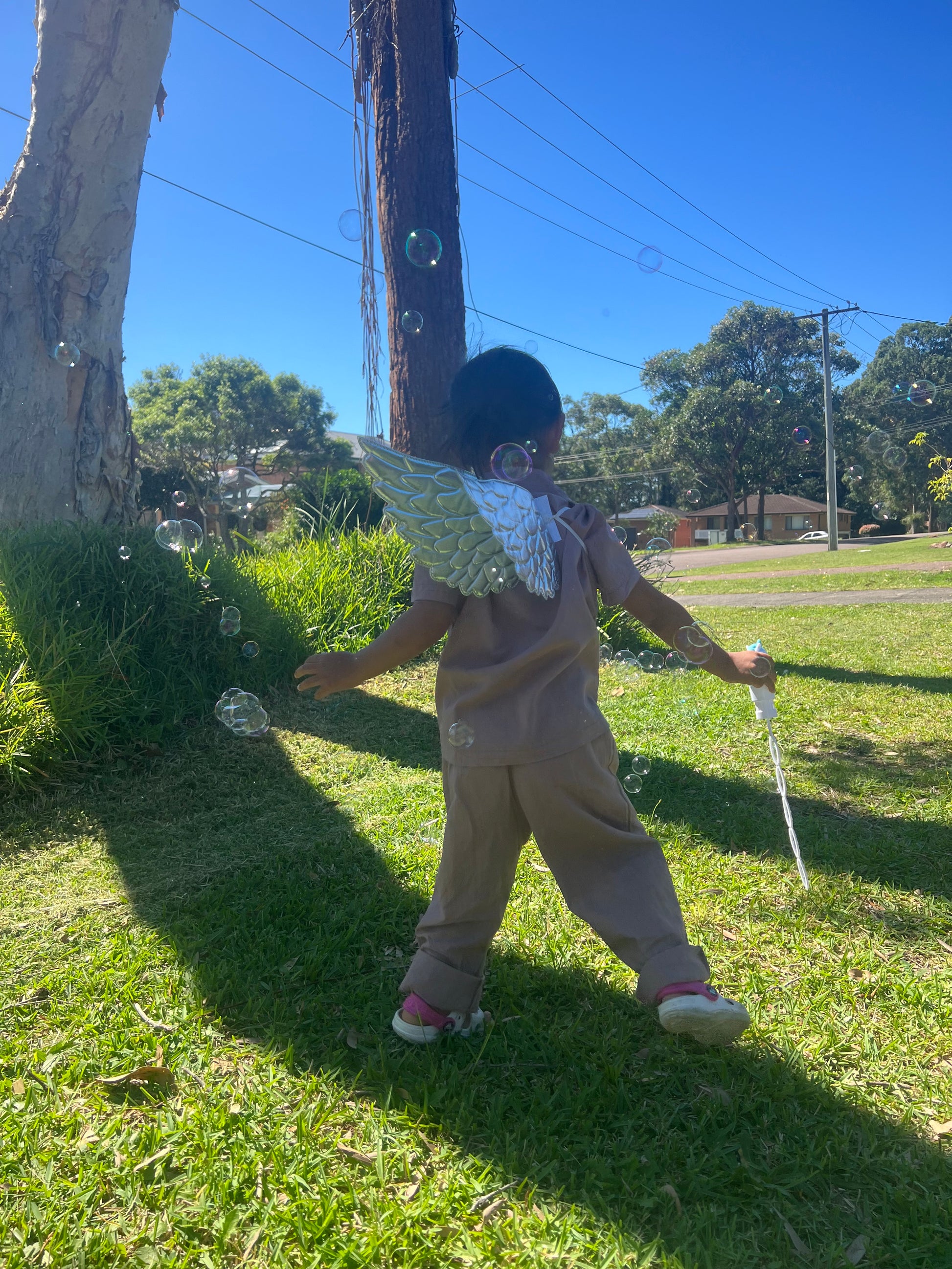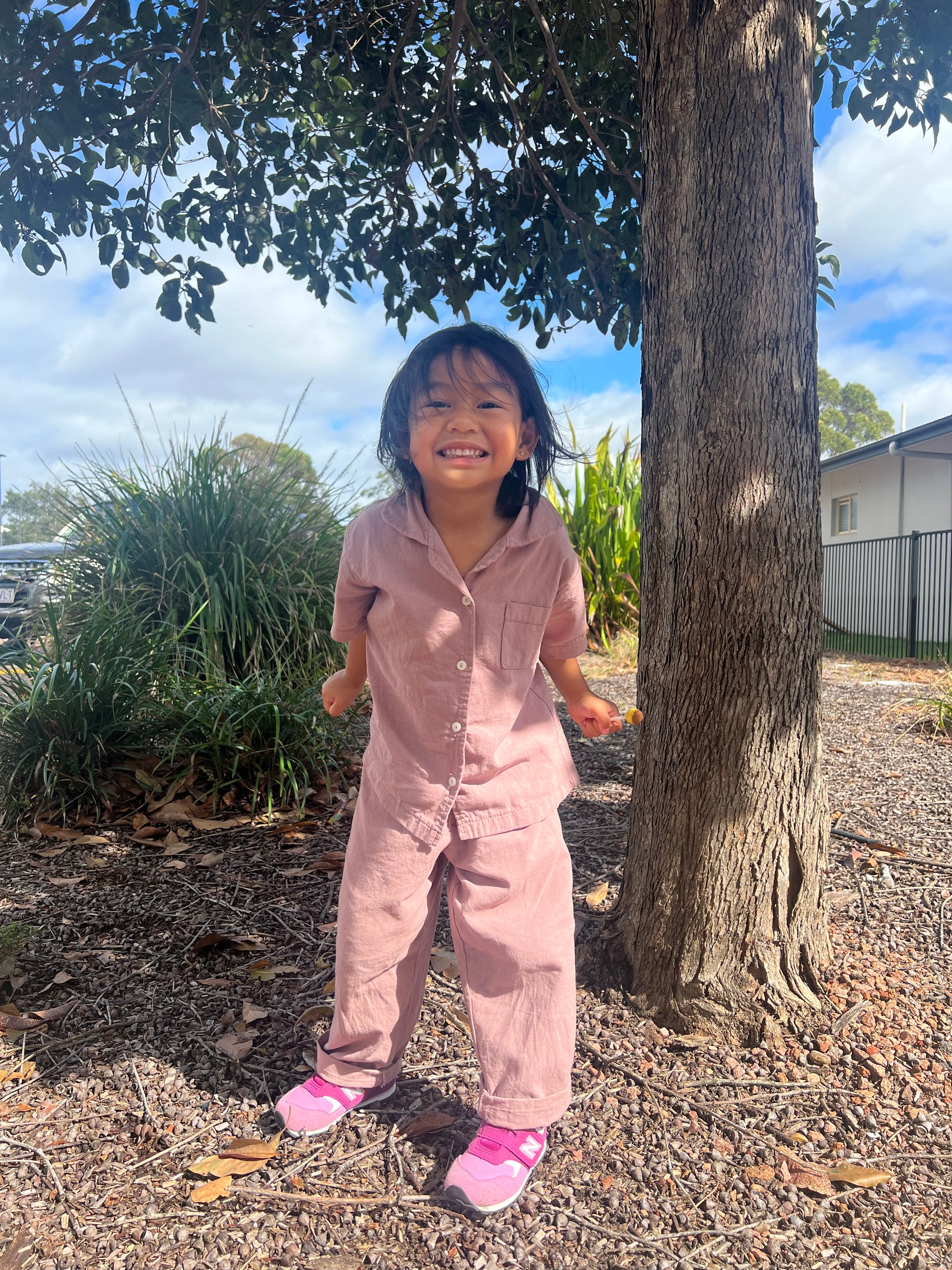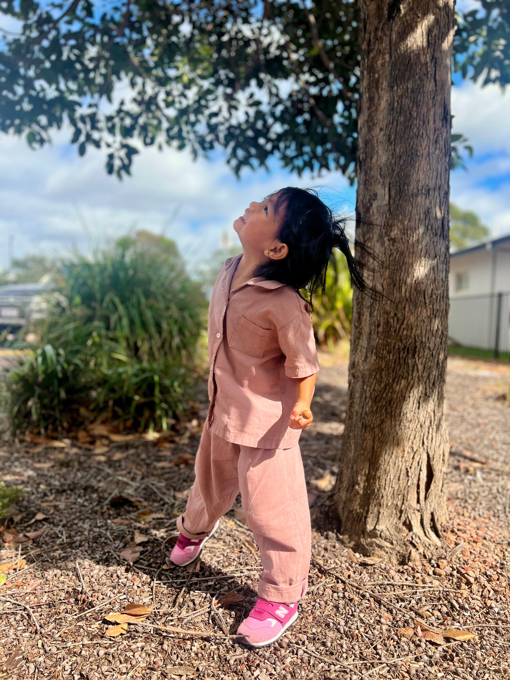Designed for gentle days and joyful play, our signature coord set features a relaxed button-up top and comfy, elastic-waist pants. Carefully handmade using a breathable cotton-linen blend, it’s made to move with little ones from slow mornings to backyard adventures.