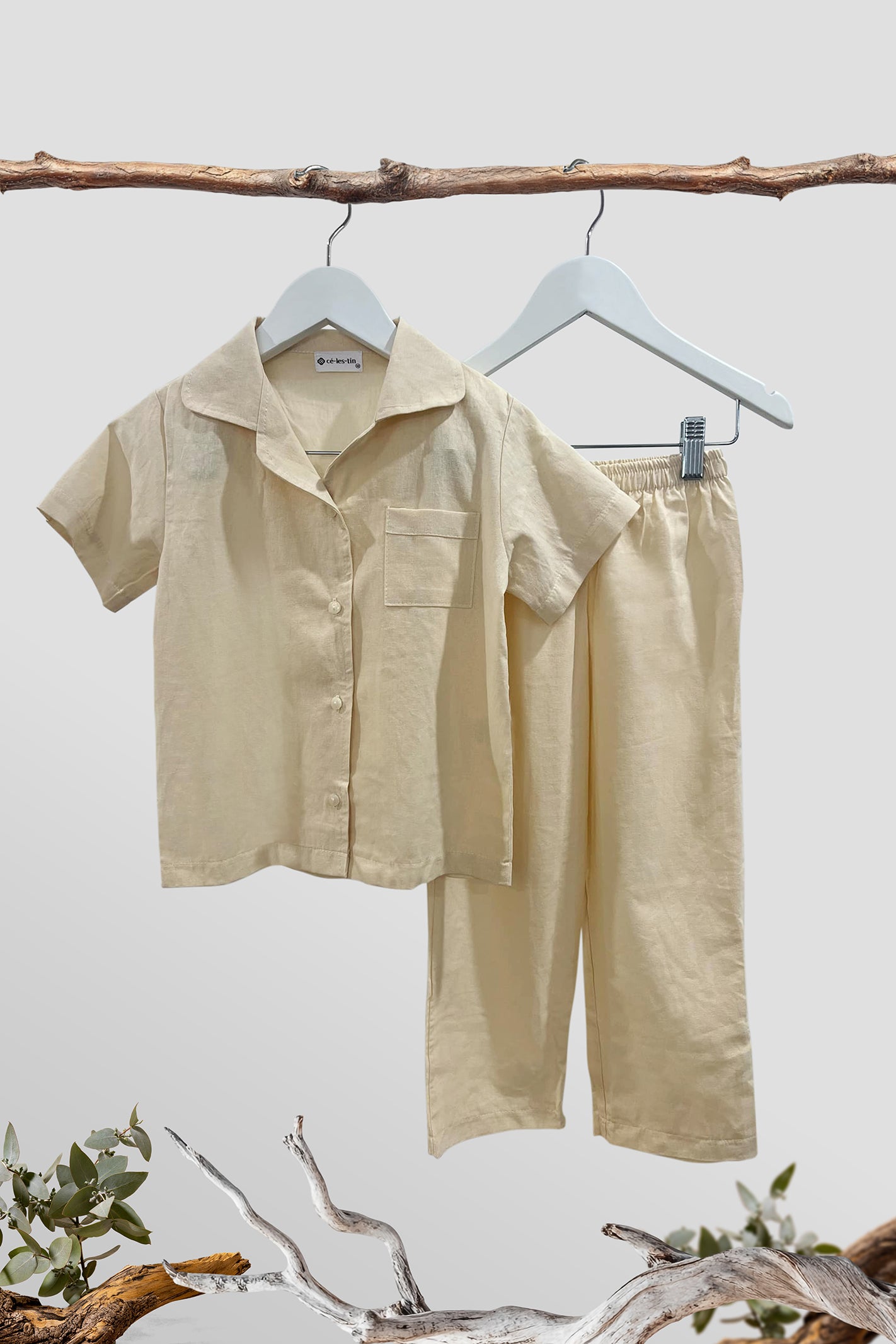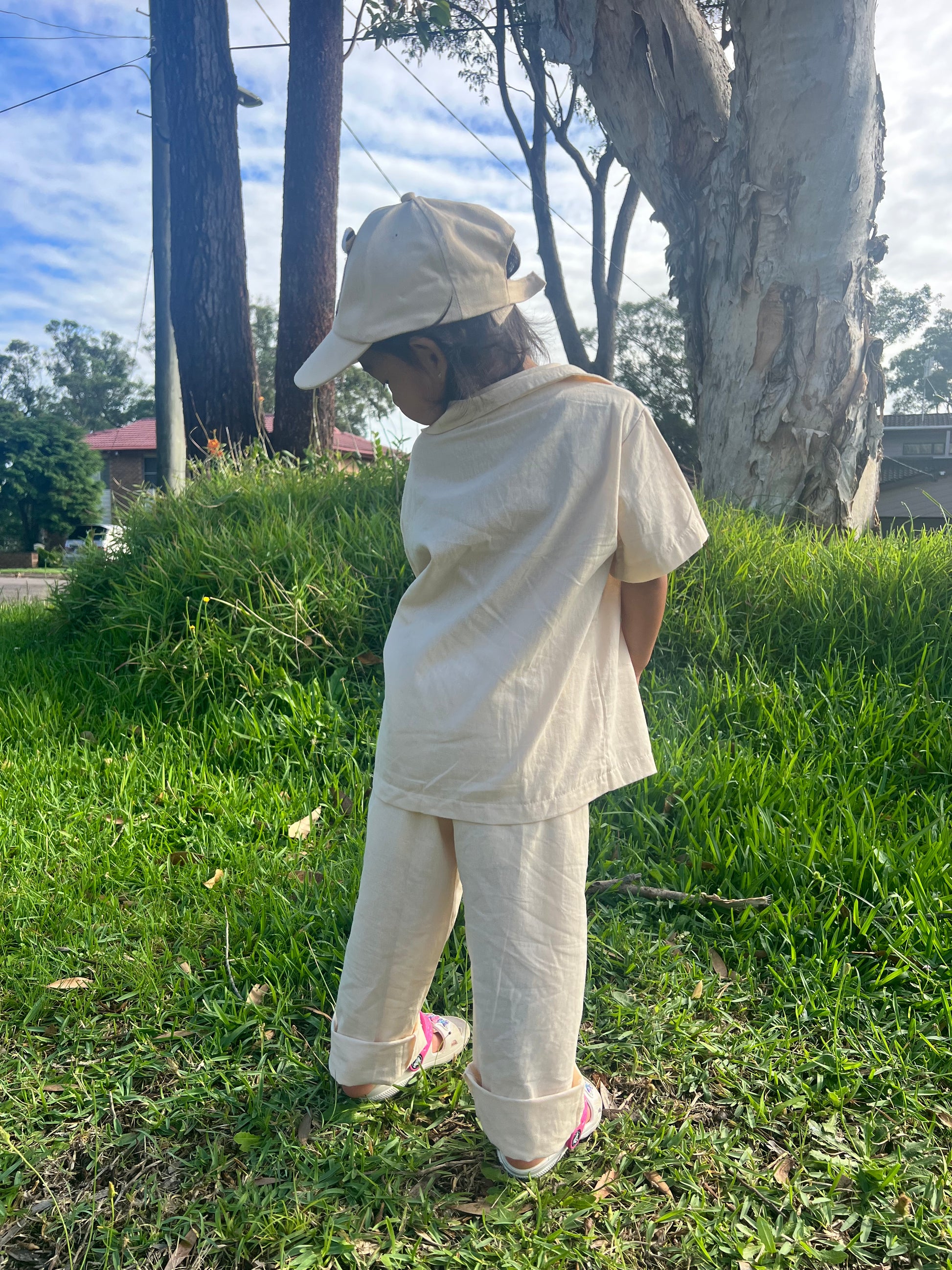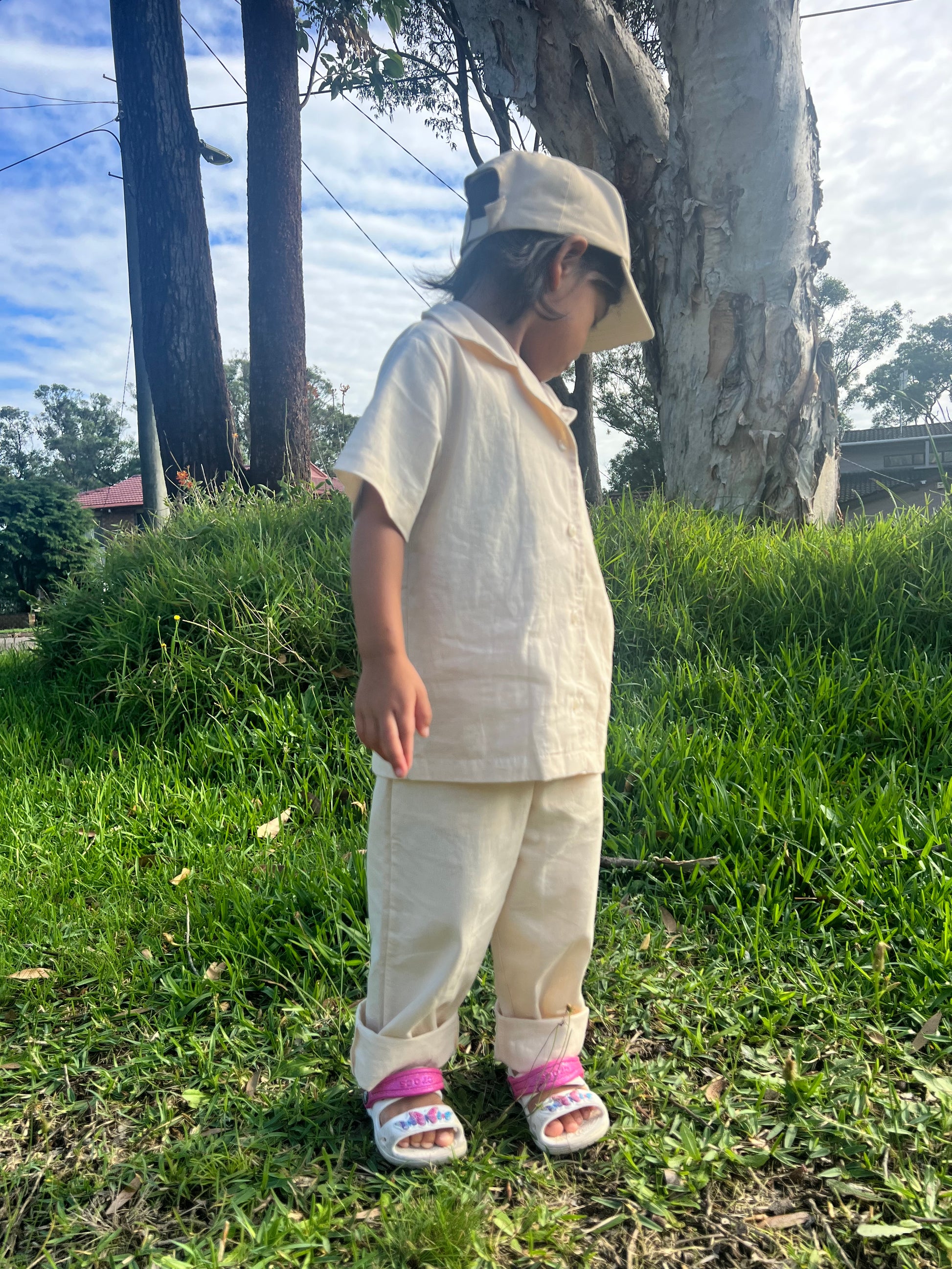 Designed for gentle days and joyful play, our signature coord set features a relaxed button-up top and comfy, elastic-waist pants. Carefully handmade using a breathable cotton-linen blend, it’s made to move with little ones from slow mornings to backyard adventures.