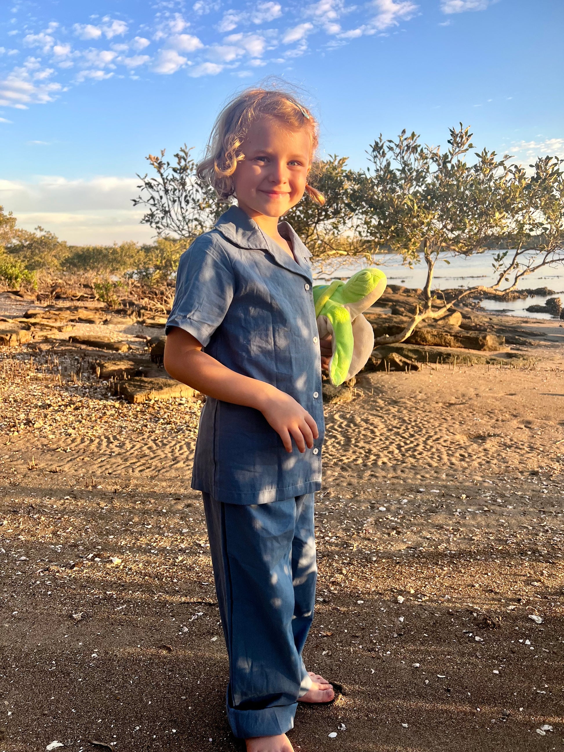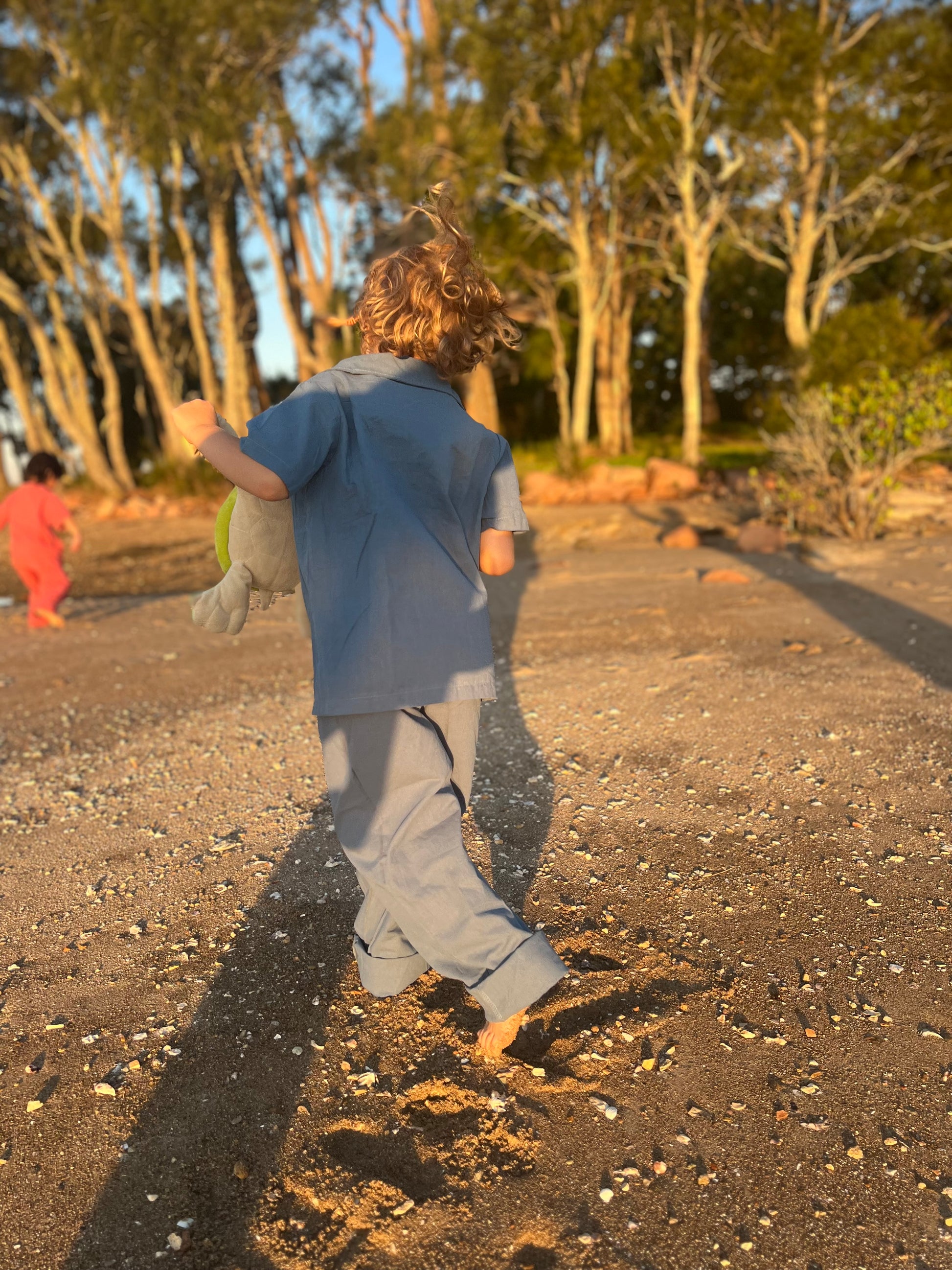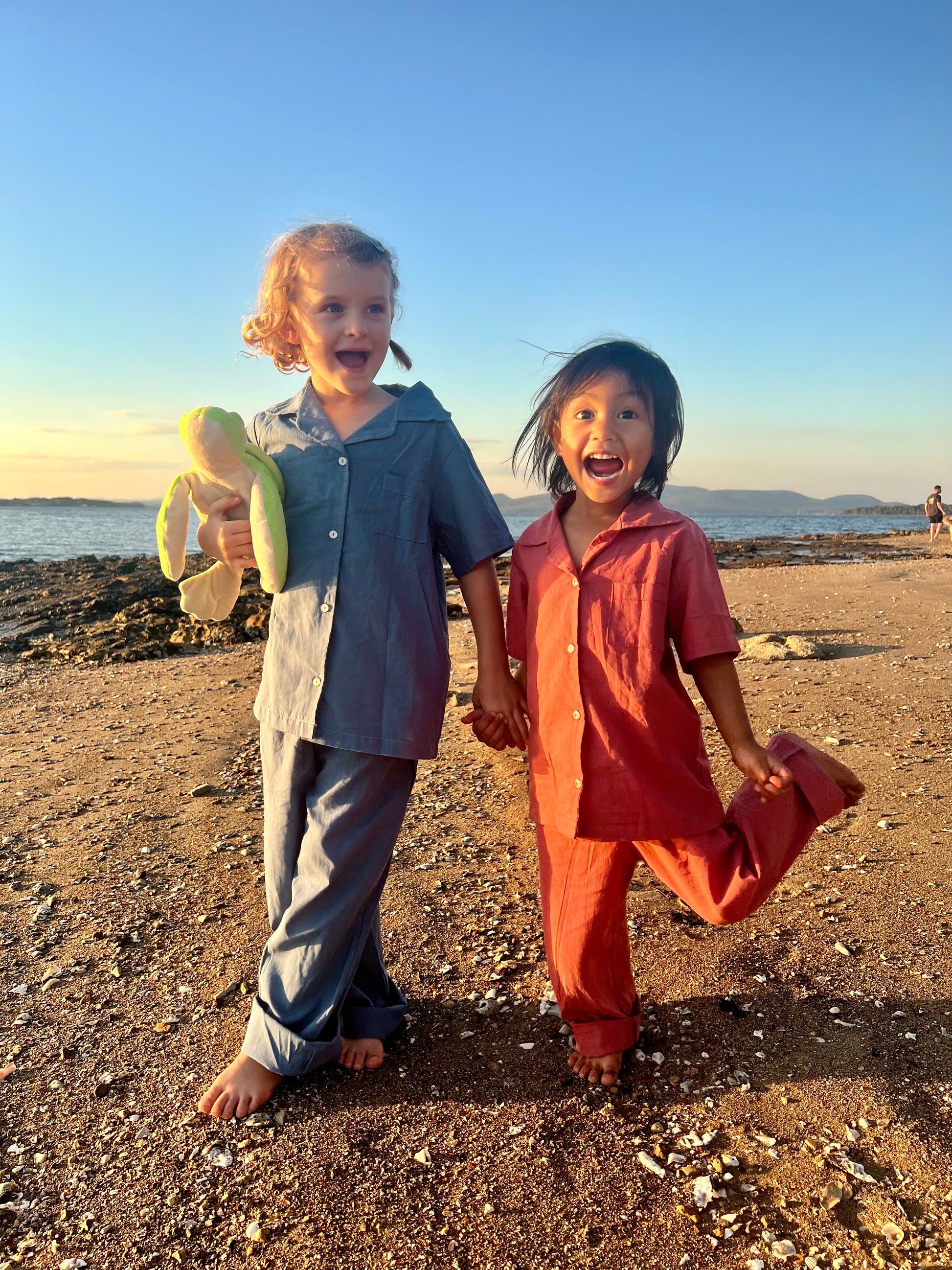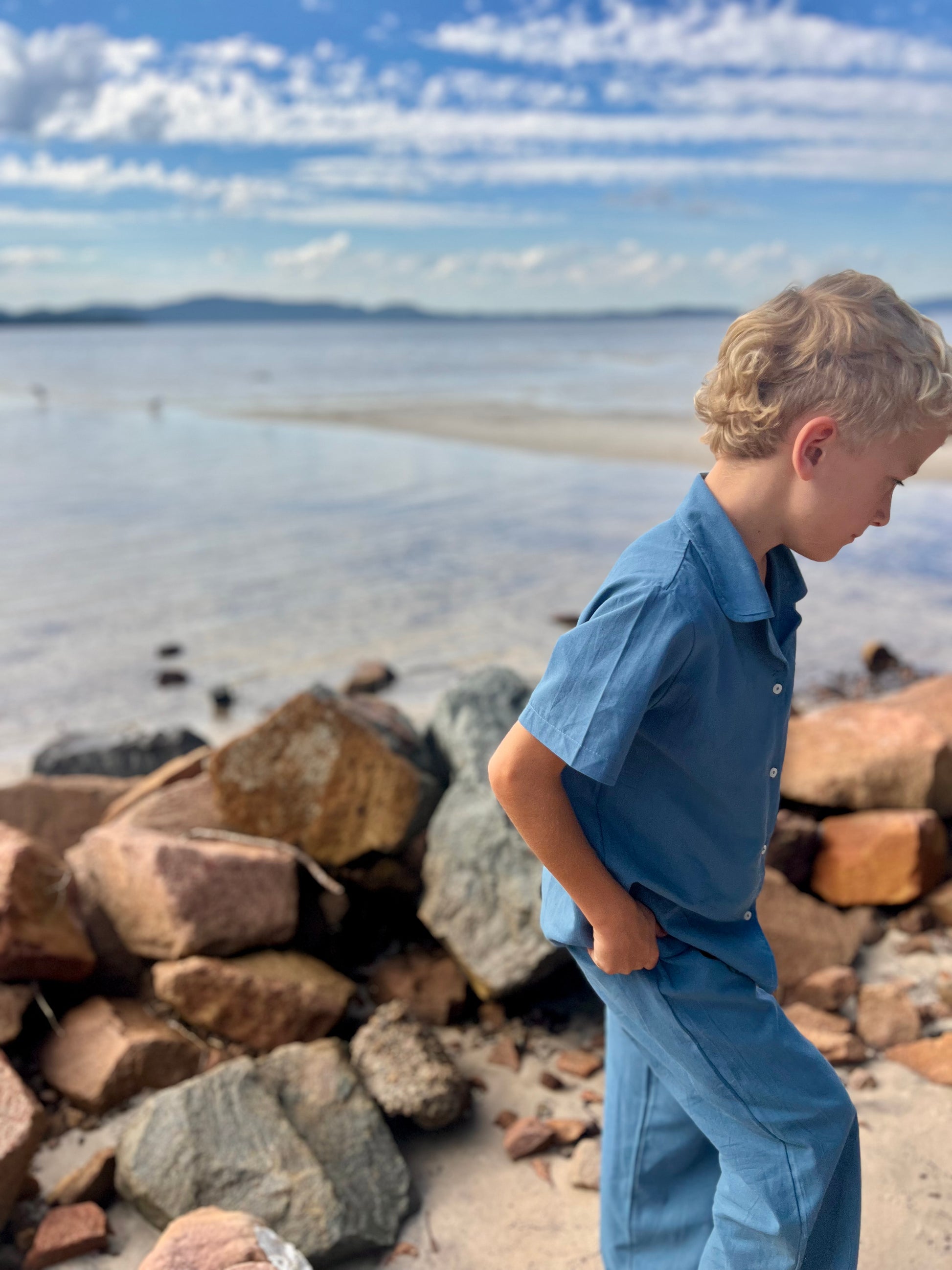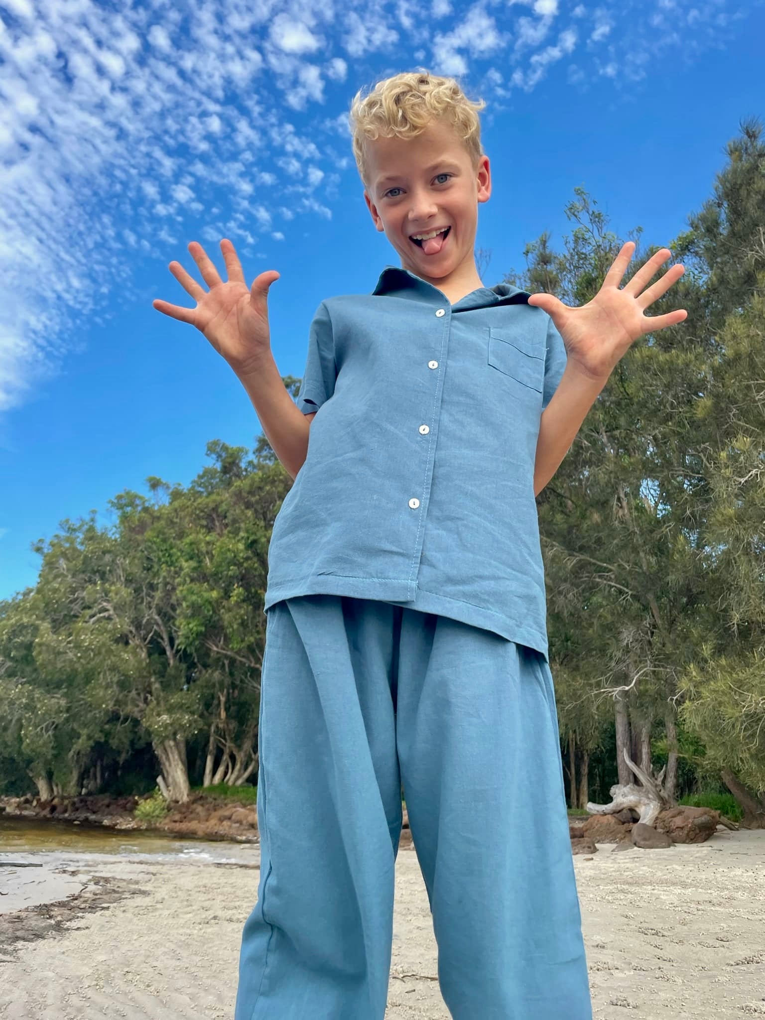 Designed for gentle days and joyful play, our signature coord set features a relaxed button-up top and comfy, elastic-waist pants. Carefully handmade using a breathable cotton-linen blend, it’s made to move with little ones from slow mornings to backyard adventures.